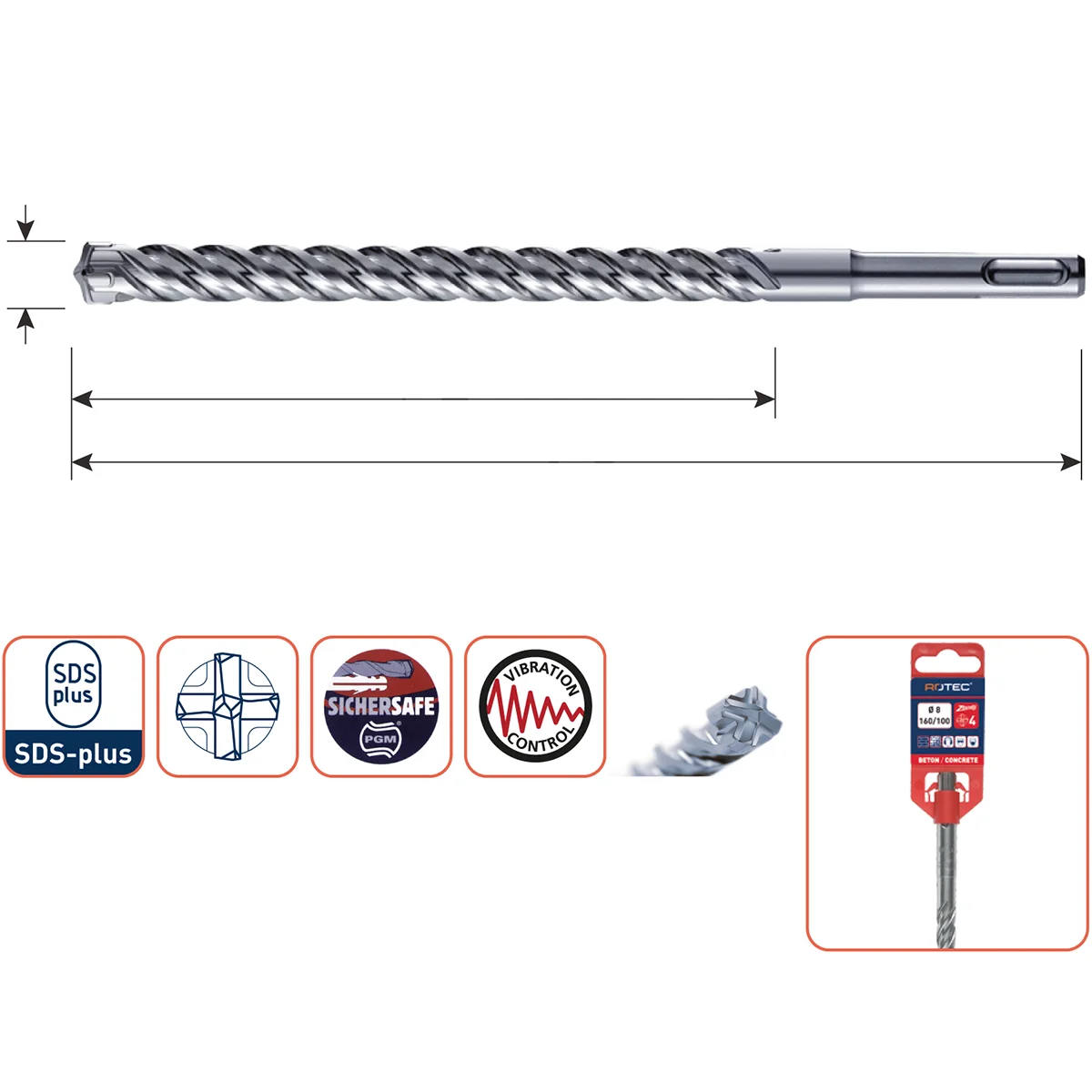 | Hammer Drill Bit, SDS-Plus, QUATTRO-X | ø16.0×110/160, ø16.0×160/210, ø16.0×210/260, ø16.0×260/310, ø16.0×400/450, ø16.0×550/600, ø16.0×950/1000, ø18.0×200/250, ø18.0×400/450, ø20.0×200/250, ø20.0×400/450, ø22.0×200/250, ø22.0×400/450, ø24.0×200/250, ø24.0×400/450, ø25.0×200/250, ø25.0×400/450, ø28.0×200/250, ø28.0×400/450, ø30.0×200/250, ø30.0×400/450, ø32.0×400/450 |