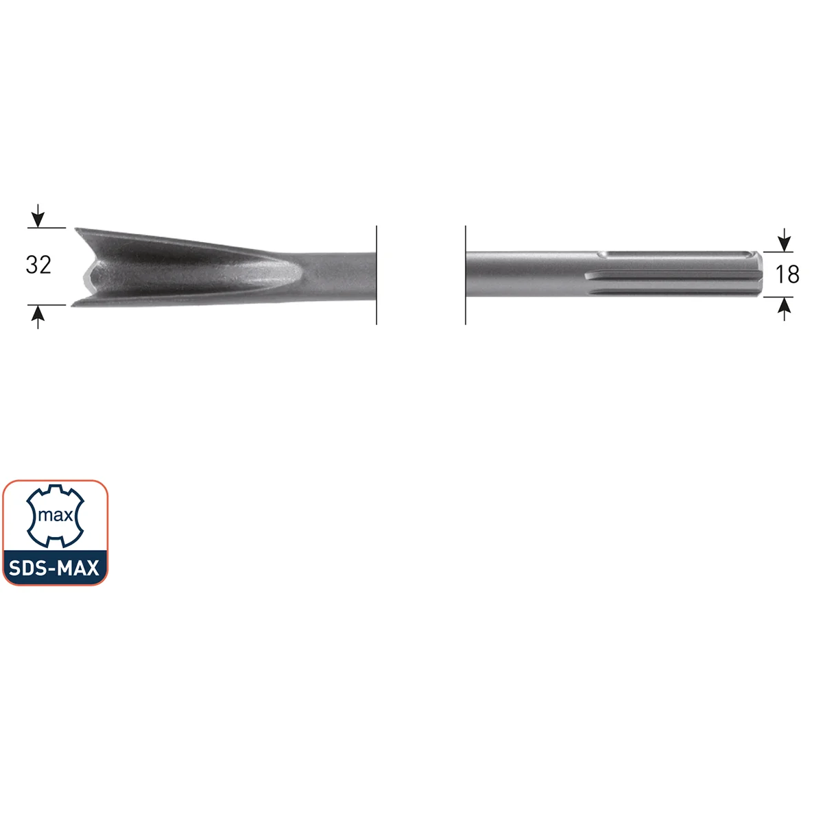Channel chisel for SDS-Max rotary hammers, suitable for cutting grooves in brick and masonry.