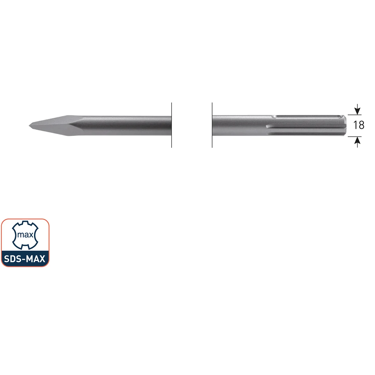 Pointed chisel for SDS-Max rotary hammers, suitable for demolition and masonry work.