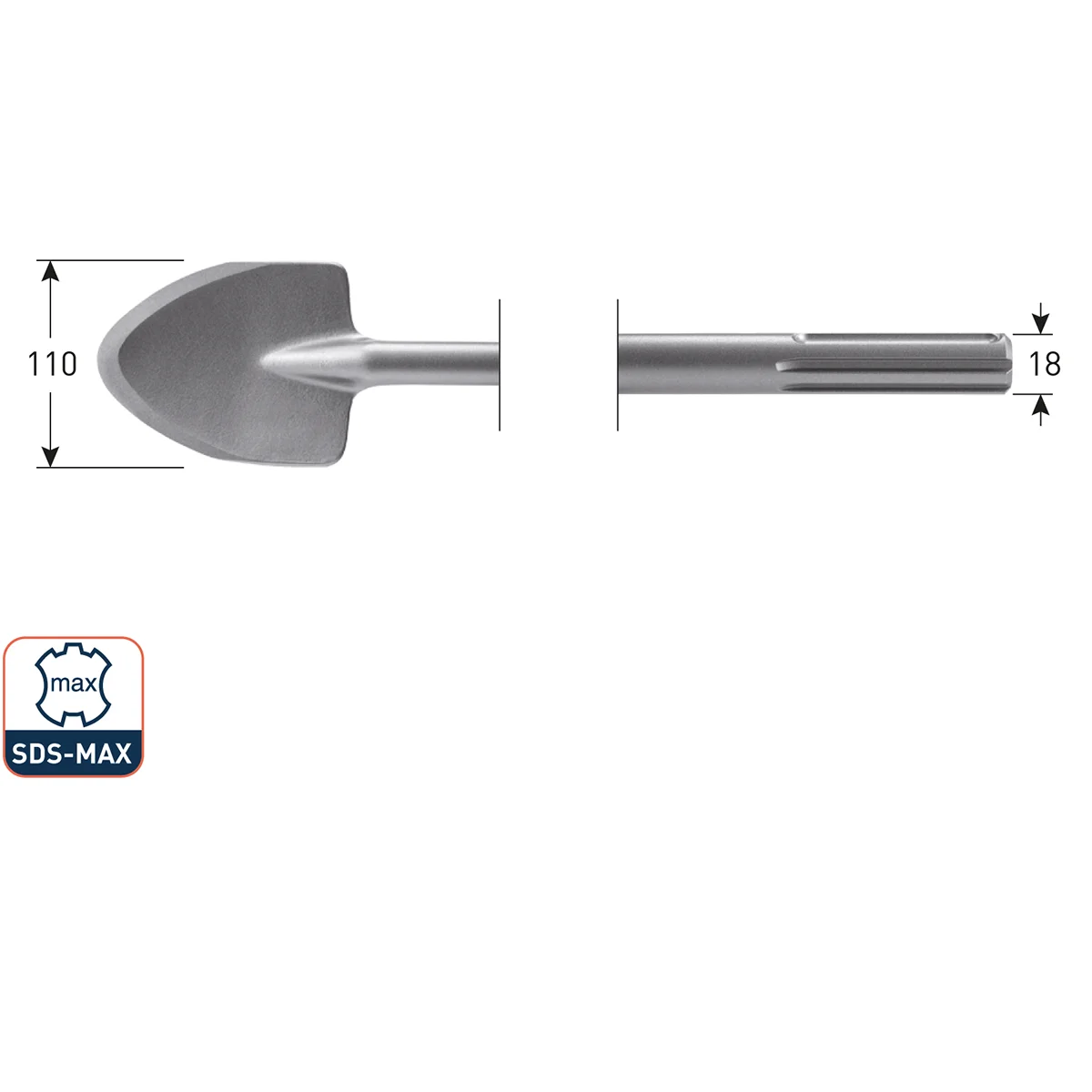 Wide spade chisel for SDS-Max hammers, suitable for digging and clearing soil, gravel, and debris.